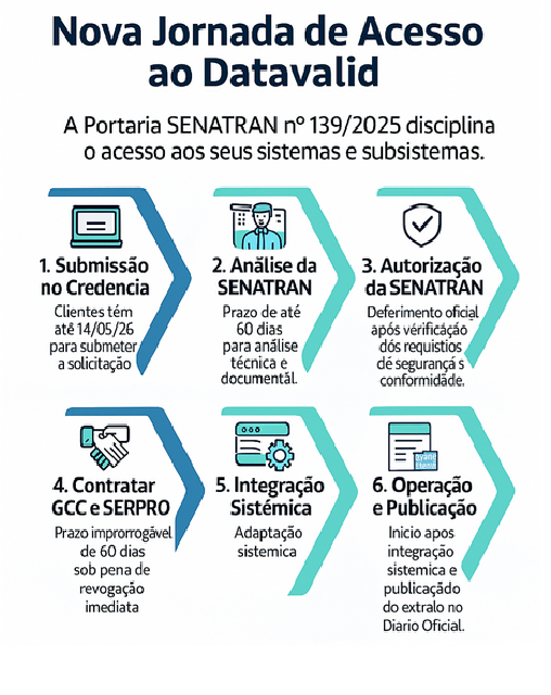 Conforme comunicado oficial da Senatran, o prazo para protocolar a solicitação é até 14 de maio de 2026. Destacamos que a não apresentação da solicitação dentro desse prazo poderá acarretar a revogação dos acessos atualmente ativos, resultando na interrupção do uso do serviço Datavalid até a devida regularização.